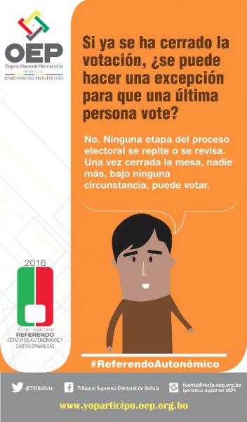 Afiche informativo con las 15 preguntas que se realizarán en el Referendo de Estatutos Autonómicos y Cartas Orgánicas 2016, en las 15 Entidades Territoriales Autónomas.