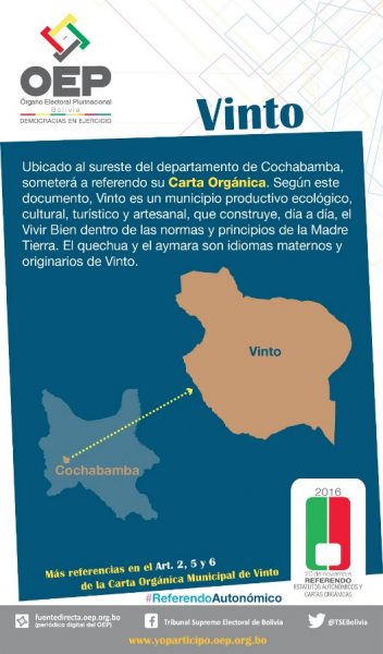 Cuña informativa sobre qué se decidirá y cuál es la pregunta que se realizará en el Municipio de Vinto, Cochabamba.