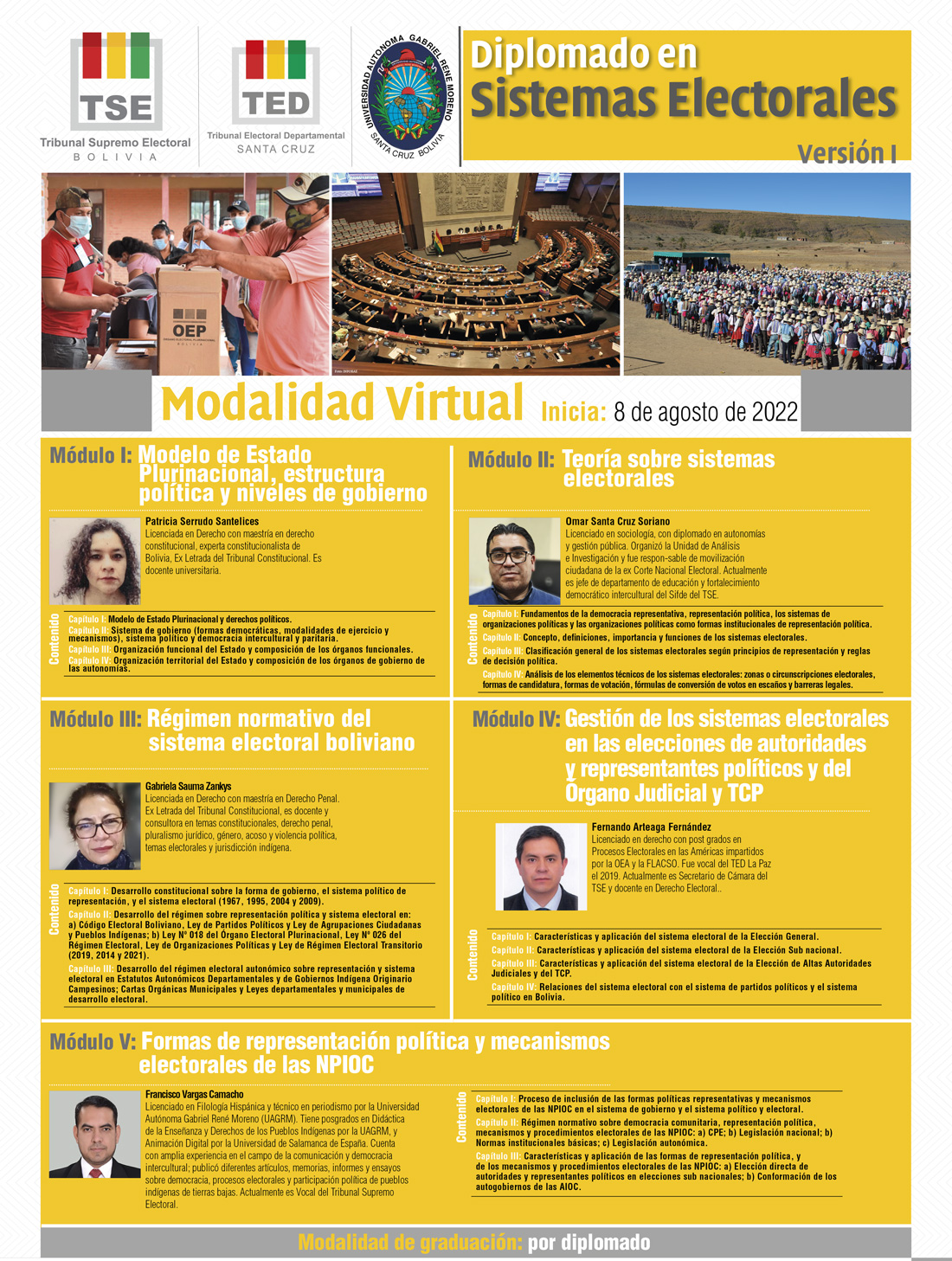 | Módulo IV | Gestión de los sistemas electorales en las elecciones de autoridades y representantes políticos y del Órgano Judicial y TCP |