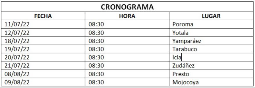 Según el cronograma establecido, la capacitación ya se realizó en los municipios de Poroma y Yotala, con presencia de autoridades, técnicos municipales y representantes de las organizaciones sociales. Esta socialización de normativa proseguirá en fechas discontinuas en los municipios de Yamparáez, Tarabuco, Icla, Zudáñez, Presto y Mojocoya.