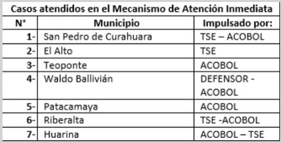 Seis de los siete casos en los que intervino el Mecanismo de Atención Inmediata corresponden al departamento de La Paz en los municipios de San Pedro de Curahuara, El Alto, Huarina, Teoponte, Patacamaya y Waldo Ballivián, mientras que uno se presentó en el departamento de Beni, municipio de Riberalta.