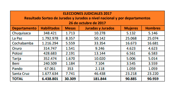 Tras el sorteo de juradas y jurados electorales de este jueves 26 de octubre que realizó el Órgano Electoral Plurinacional (OEP), 181.844 ciudadanas y ciudadanos fueron elegidas y elegidos para administrar las mesas de sufragio este 3 de diciembre, según lo anunció la presidenta del Tribunal Supremo Electoral (TSE), Katia Uriona Gamarra. En cumplimiento con la paridad de género, el sorteo previó la misma cantidad de mujeres (90.885) y de hombres (90.959).
