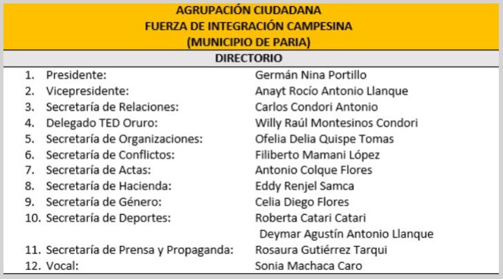 En la agrupación ciudadana FIC del municipio de Soracachi fue elegido presidente Germán Nina Portillo y como vicepresidente Anayt Rocío Antonio Llanque, la elección se hizo en Congreso Ordinario el sábado 29 de julio de 2022, donde también fueron electas y electos 10 dirigentes.