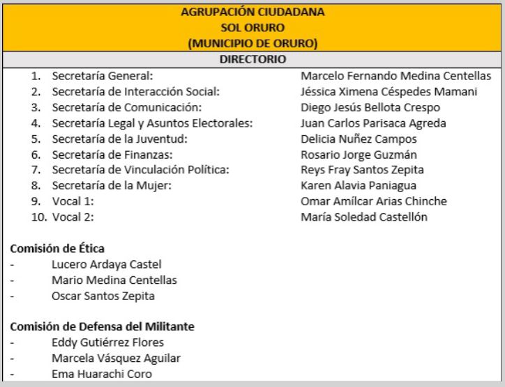 Por su lado, la agrupación ciudadana Sol Oruro, del municipio capital de Oruro, fue elegido en la Secretaría General Marcelo Medina Centellas y en la Secretaría de Interacción Social, Jéssica Ximena Céspedes Mamani, junto a otras ocho carteras; además de las comisiones de Ética y Defensa del Militante, el jueves 4 de agosto.