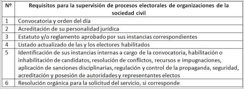 Es decir, en el marco de la Ley 026 del Régimen Electoral y el Reglamento de Supervisión aprobado por el Tribunal Supremo Electoral (TSE), se establece que la supervisión es a juntas vecinales, gobiernos estudiantiles, organizaciones profesionales, gremiales o sindicales, entre otros más.