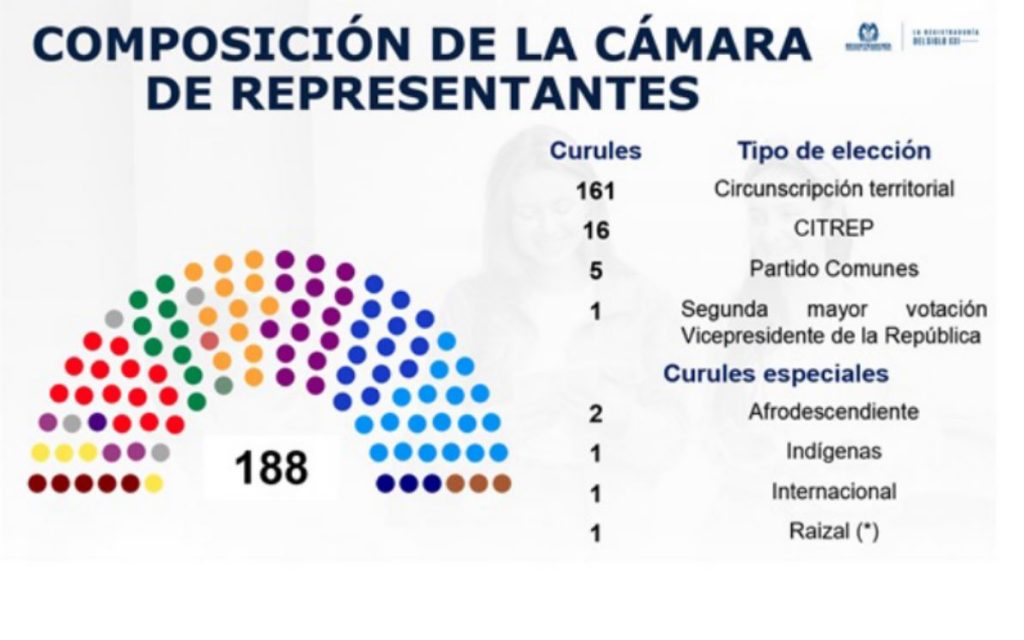 Además se elegirán a 188 autoridades en la Cámara de Representantes, de los cuales 161 corresponden a un tipo de elección por circunscripción territorial, 16 curules a las Circunscripciones Transitorias Especiales de Paz – CITREP, 5 a los Partidos Comunes, 1 a la segunda mayor votación vicepresidente de la República, 2 a las comunidades Afro-descendientes, 1 a la circunscripción indígenas, 1 a la circunscripción internacional, y finalmente 1 para los raizales de San Andrés y Providencia.