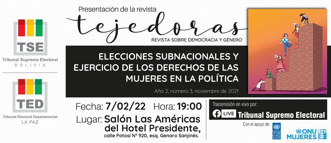 El Tribunal Supremo Electoral (TSE) y el Tribunal Electoral Departamental de La Paz presentarán el tercer número de la revista sobre democracia y género Tejedoras, en un acto público que se desarrollará este lunes 7 a horas 19.00 en salones del hotel Presidente. En este número se analiza las Elecciones Subnacionales y el ejercicio de los derechos de las mujeres en la política.