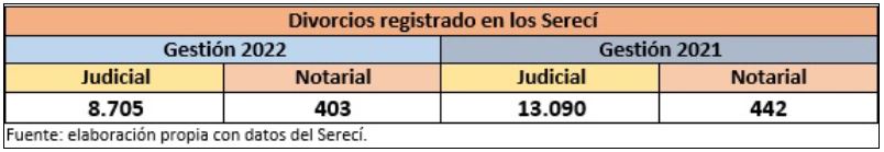 Según los datos del Servicio de Registro Cívico (Serecí), dependiente del Tribunal Supremo Electoral (TSE), entre enero y diciembre de 2022 se registraron 8.705 divorcios que fueron resueltos por la vía judicial, en comparación con la gestión 2021, en la que hubo 13.090; en cambio, los datos sobre una separación por acuerdo mutuo, que es el divorcio notarial, no tuvieron una variación muy significativa, ya que en la gestión 2022 sumaron 403 casos y en 2021 llegaron a 442 registros.