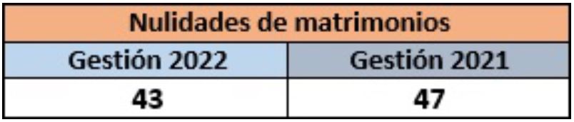 El número de nulidades de matrimonios registrados en el Serecí, tanto en la gestión 2022 como 2021, se asemejan. Estas son declaradas judicialmente y proceden por las causales previstas en el artículo 168 del Código de Familias y del Proceso Familiar.