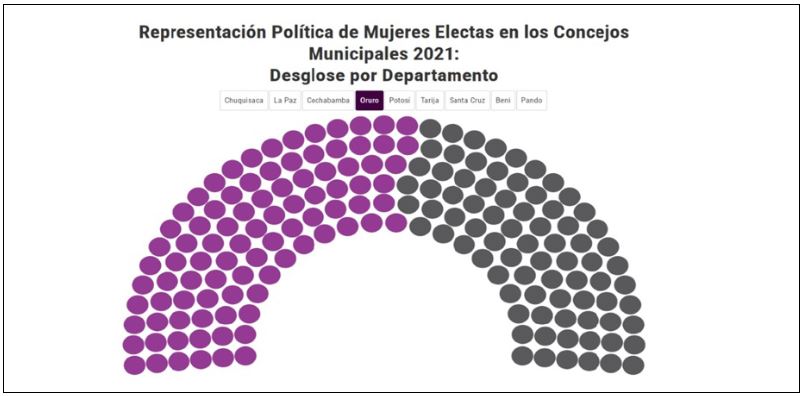 Cabe resaltar que la participación de la mujer en la política local de Oruro es fundamental, por ejemplo, en la Elección de Autoridades Políticas Departamentales, Regionales y Municipales 2021 en el departamento fueron electas 91 concejalas titulares, lo que representa el 54 % de las autoridades elegidas en los 33 municipios.