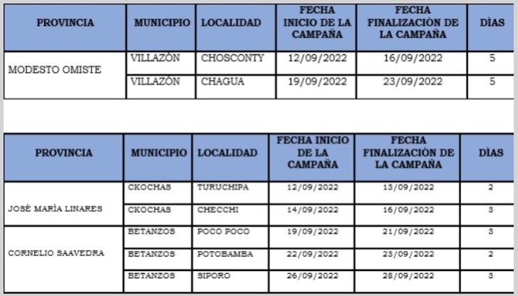 Los municipios de Villazón, Ckochas y Betanzos del departamento de Potosí concluyó este miércoles 7 septiembre la ejecución del proyecto de registro, saneamiento y certificación gratuita de partidas de nacimiento y empadronamiento electoral biométrico, quienes se unieron a la ejecución del proyecto de registro, saneamiento, certificación y empadronamiento electoral biométrico.