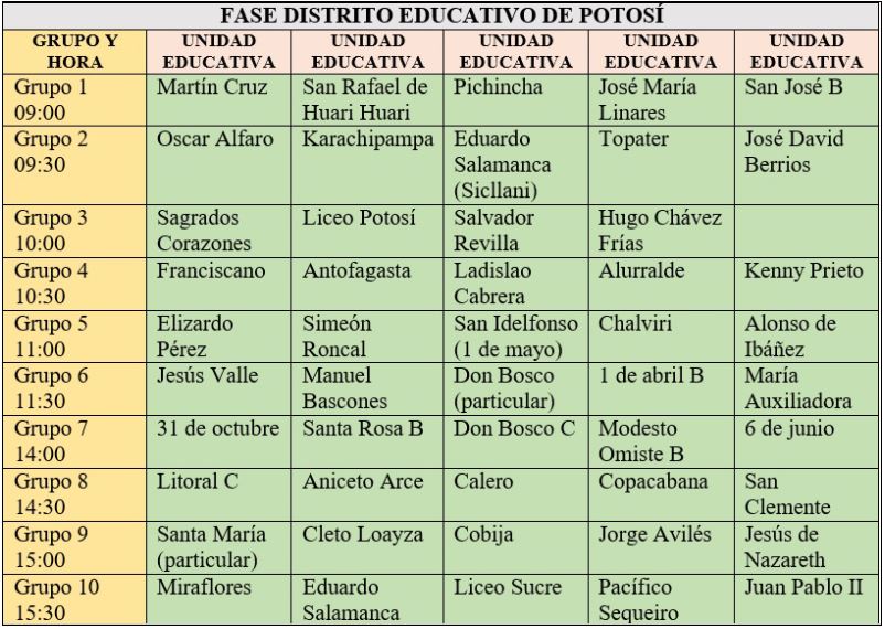 Asimismo, el distrito educativo de Potosí que cuenta con la mayor cantidad de equipos inscritos en esta competencia, el jueves 24 de agosto realizó el sorteo para su fase distrital, la cual quedó de la siguiente manera: