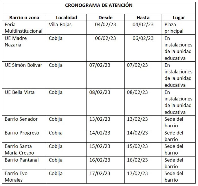 Las unidades educativas Madre Nazaria, Simón Bolívar, Bella Vista, Barrio Senador, Progreso, Santa María Crespo, Pantanal y el barrio Evo Morales serán el centro donde las brigadas atenderán a todas las ciudadanas y ciudadanos, hasta el 17 de febrero, para sanear documentos fundamentales, como el certificado de nacimiento, informó Nuñez.