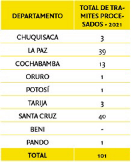 Los datos fueron proporcionados por el Serecí, a través del informe de gestión y rendición pública de cuentas del TSE 2021, publicada en la página web Informe TSE gestión 2021, web.oep.org.bo.