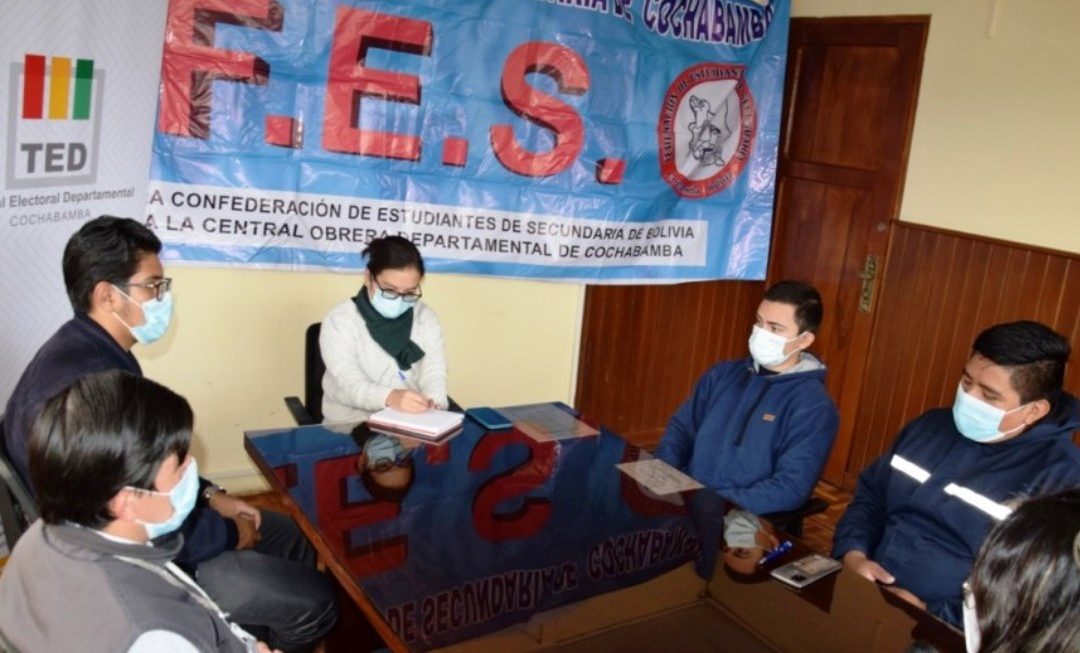 El Tribunal Electoral Departamental (TED) de Cochabamba sostuvo una reunión técnica de coordinación con representantes de la Federación de Estudiantes de Secundaria (FES) para tratar el tema sobre la “Elección de Gobiernos Estudiantiles”, en unidades educativas de la región.