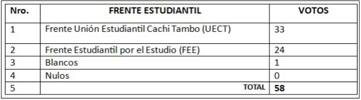 Ahora, el Frente Unión Estudiantil Cachi Tambo (UECT) espera la posesión del 12 de abril, que según el calendario electoral se realizará en todas las unidades educativas del departamento de Potosí.
