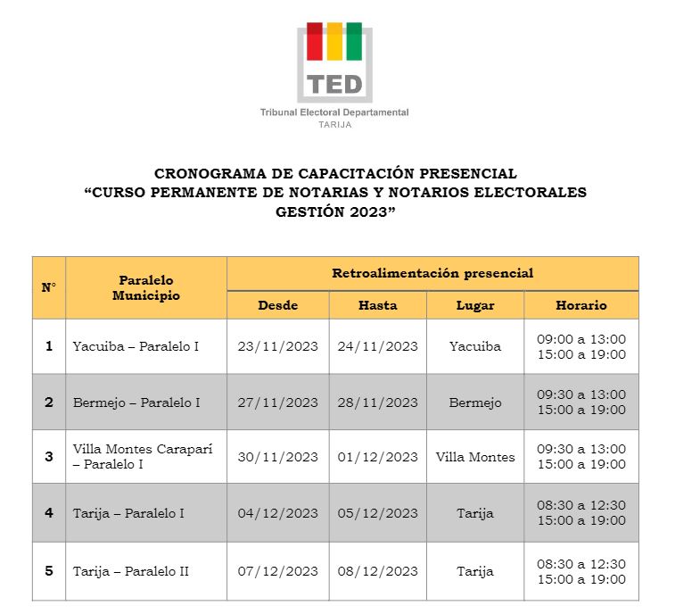 El Tribunal Electoral Departamental (TED) de Tarija, a través del Servicio Intercultural de Fortalecimiento Democrático (Sifde), finalizó este 15 de noviembre la capacitación a más de 100 ciudadanas y ciudadanos que participaron en el curso permanente de notarias y notarios electorales (modalidad virtual) en los municipios de Yacuiba, Bermejo, Villa Montes, Caraparí y Tarija.