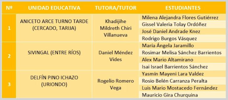 Los ganadores de la final departamental representarán a Tarija en la semifinal nacional, donde equipos ganadores de los nueve departamentos del país competirán del 12 al 14 de de octubre. La tercera etapa nacional será con tres equipos clasificados de entre los nueve departamentos y se efectuará de manera presencial en la ciudad de La Paz, el 25 de octubre.
