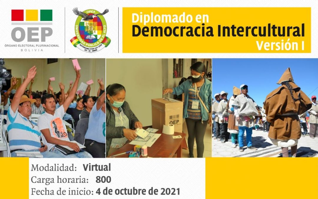 Este lunes 30 de agosto a horas 10.00 se realizará la presentación del Diplomado en Democracia Intercultural, en el marco del convenio suscrito entre el Tribunal Supremo electoral (TSE) y la Universidad Pública de El Alto (UPEA). El acto se desarrollará en el salón Huáscar Cajías del TSE y se transmitirá en vivo por Facebook Live.