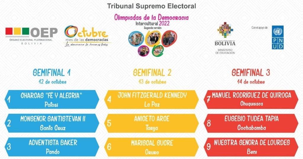 Los estudiantes que representan a Potosí, Santa Cruz y Pando serán los primeros en competir en las semifinales de las Olimpiadas de la Democracia Intercultural 2022 que se realizará desde…