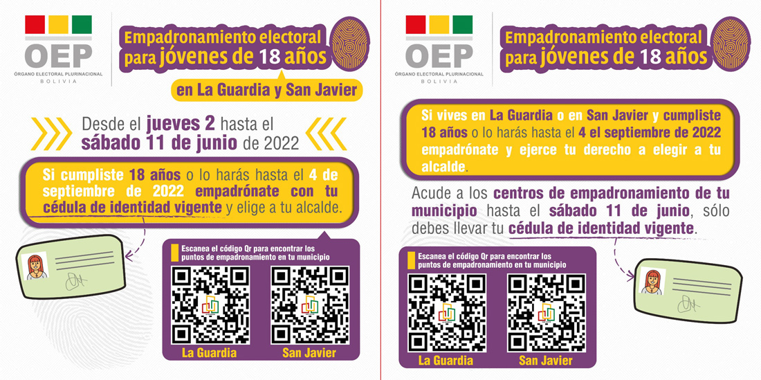 Para las Elecciones Extraordinarias de Alcalde o Alcaldesa en los municipios cruceños de La Guardia y San Javier, el Tribunal Supremo Electoral determinó abrir un periodo de empadronamiento masivo para…