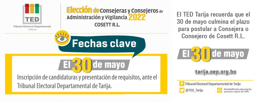 El TED Tarija recuerda que el 30 de mayo culmina el plazo para postular a Consejera o Consejero de Cosett R.L.