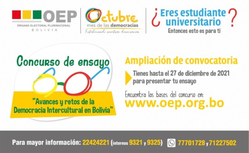 El Tribunal Supremo Electoral (TSE) decidió ampliar el plazo de presentación de ensayos del Concurso Nacional de Ensayo sobre Democracia Intercultural en Bolivia hasta el 27 de diciembre de la…